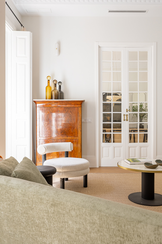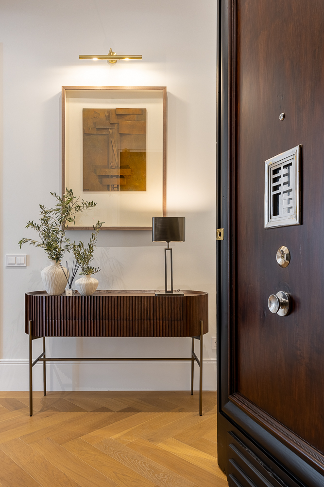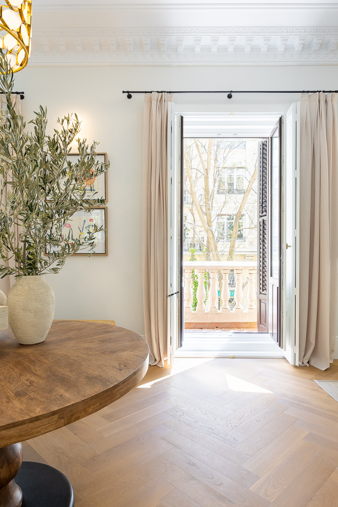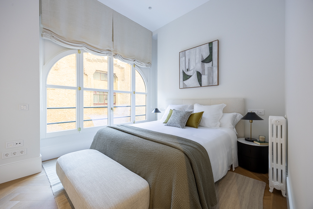 Situada en la planta principal de un edificio representativo de principios del siglo XX, la vivienda dispone de techos de 3,70 metros de altura y 14 balcones exteriores. Ha sido reformada integralmente con diseño contemporáneo y cuenta con una superficie de 471 metros cuadrados distribuidos en dos amplias zonas de salones, comedor independiente, despacho, sala de estar/TV, cocina semi-integrada, cinco dormitorios en suite (el principal de más de 80 metros cuadrados, con dos balcones y vistas al Retiro, zona de estar, dos vestidores, baño exterior), aseo de cortesía, área de lavandería y trastero.